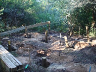 You see,.. my semi- retired father and I are building a wooden cottage in the Outeniqua indigenous forest. It is a very modest cottage built for family needs; rectangular in plan, with a double pitch corrugated iron roof. When I say we are building the house I don’t mean it as a metaphor for designing and drawing plans for, or a metaphor for sitting around watching the contractor’s progress. No; I mean we are physically, digging, measuring, cutting and fitting (and sometimes knocking down)
