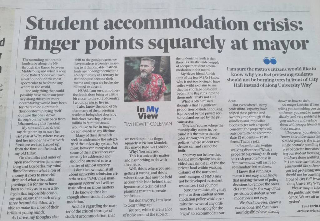 Now I know that running a metro is not easy and I know that making the kind of policy decisions to remove the obstacles standing in the way of the provision of student accommodation is not easy. We also however know that it can be done and that other municipalities have already shown us how to do it. So, to Mayor Lobishe, if I am telling you something you did not know, you need to immediately (and very publicly) fire your advisors and replace them with people literate in these matters. If however, you already know and understand that NMBM policy is the largest single obstacle standing in the way of private investors solving our student housing crisis and have done nothing about it, I am sure the citizens of NMB Metro would like to know why you feel protesting students should not be burning tyres in front of City Hall instead of along University Way.