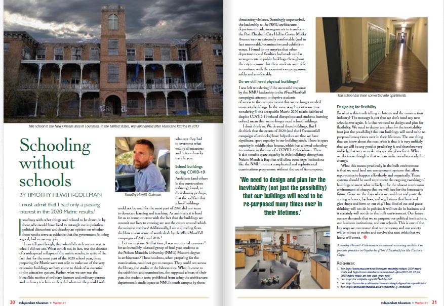 Architects (and others in the construction industry) found to their dismay perhaps that the sad fact that school buildings could not be used for the most part of 2020 did not seem to devastate learning and teaching. You see, Architects are generally blessed with very large egos and it is very hard for us to come to terms with the fact that the buildings we commit our lives to creating are not the centre around which the universe revolves! Besides, we are still reeling from the blow to our sense of worth dealt by the #FeesMustFall campaign of 2017. Let me explain. I remember being an external examiner that year for an incredibly talented group of final years in the Nelson Mandela University Masters degree in Architecture. For much of 2017 these students preparing for the exam could not get to campus. They could not access the library, the studio or the labs. When it came to the exhibition and examination, that was the climax of their year, they were prohibited by those threatening violence, from using the Architecture department’s studio space at NMU’s south campus. Seemingly unperturbed, the clever leadership at the NMU Architecture department made arrangements and transformed the City Hall in Govan Mbeki avenue into a very comfortable (and in fact memorable) examination and exhibition venue. I found to my surprise that other departments and faculties had made similar arrangements in public buildings throughout the city to ensure that their students were able to safely and comfortably continue with the examinations programme. I was left wondering that year if the very successful response by the NMU leadership to the #Feesmustfall campaign’s attempt to deprive students access to the campus meant that we no longer needed university buildings? In the same way, I am now left wondering if the acceptable Matric 2020 results mean that we no longer need school buildings. But after having given this some thought over the weekend, I can tell you that, no, I don’t think so. We do need these buildings. But I do think that the events of 2020 (and of 2017) help us see that we have significant spare capacity in our building stock. There is spare capacity in middle class houses that allow schooling to continue in the case of a COVID lockdown and there is notable spare capacity in civic buildings throughout Nelson Mandela Bay that will allow even large institutions like the NMU to run a complicated and sophisticated examinations programme without the use of its campuses.