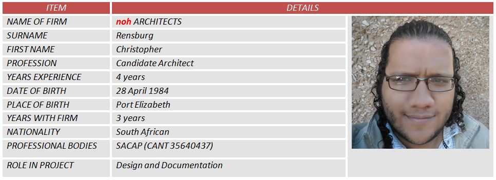 Christopher studied at the Nelson Mandela Metropolitan University under the direction of Andrew Palframan. He graduated in 2014, completing a treatise on A critical exploration of the visitor’s centre typology through the Design of a Biodiversity Visitor’s and Research Centre. He served as a committee member on the Architectural Student Society. Christopher is a member of the Golden Key Society