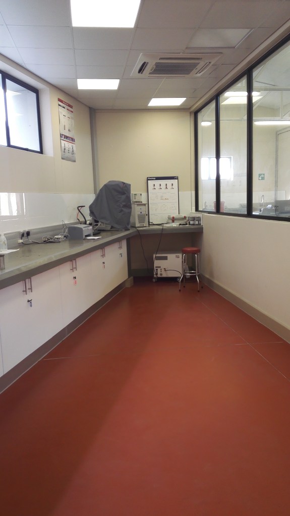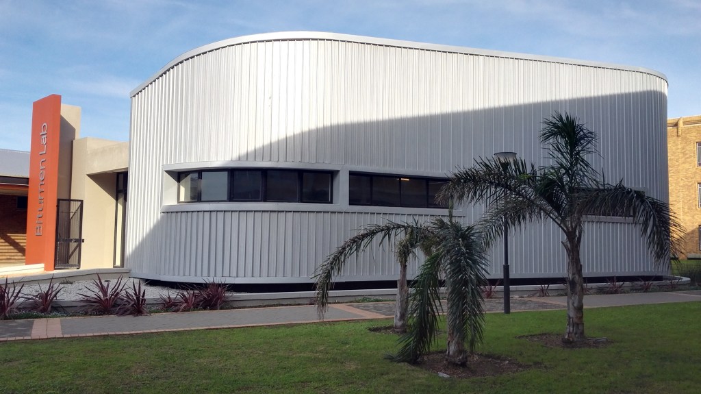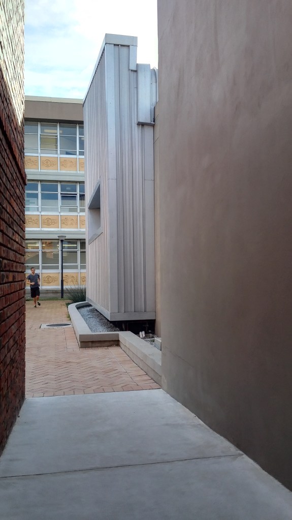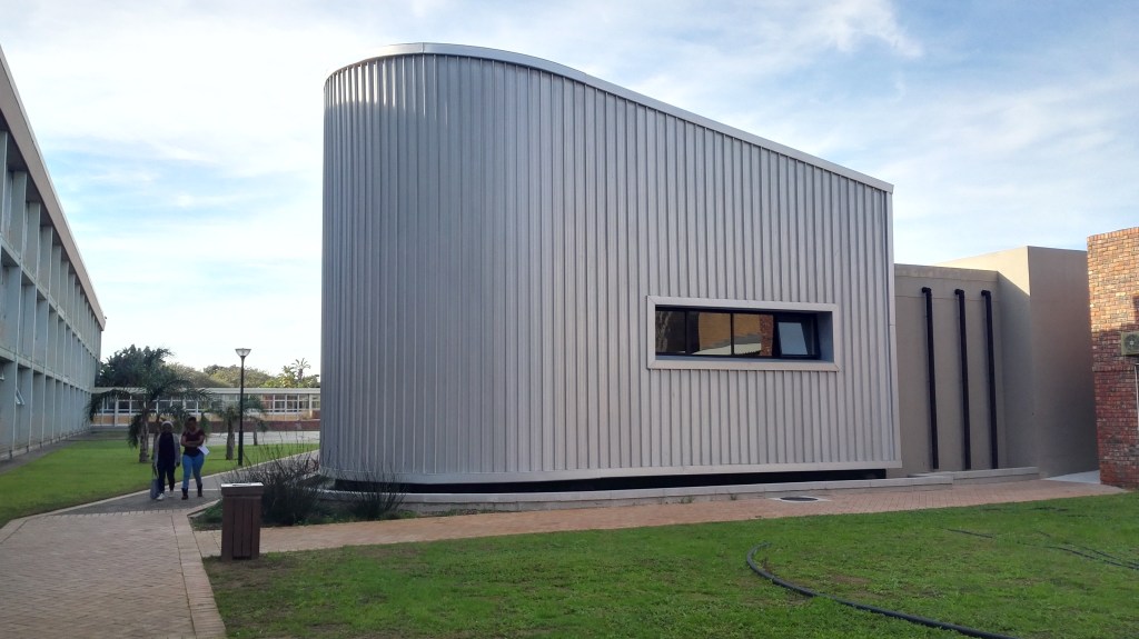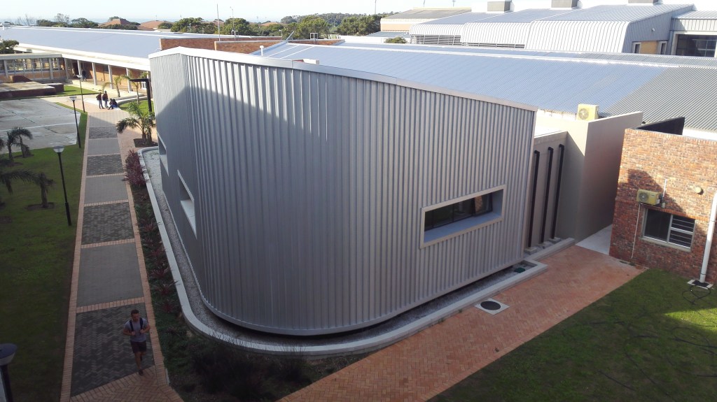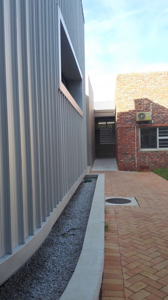 “The Bitumen Lab”, is a small intervention in the “North Campus” at the Nelson Mandela University. While the building is an integral part of the campus, its function is “commercial” and not educational, providing crucial quality testing into the Civil Engineering Sector. It locates itself in one of the many courtyards formed by uniform, indistinct utilitarian classroom blocks and support facilities. Other than being informed by the specialized internal functional requirements, the plan form is informed by pre-existing pedestrian movement patterns through the courtyard.