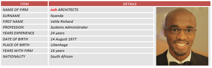 From 2007 till present Velile joined NOH Architects working as a System Administrator. Velile’s work is intensely focused in working with people, maintaining computers hardware, bids and tenders also managing company data.